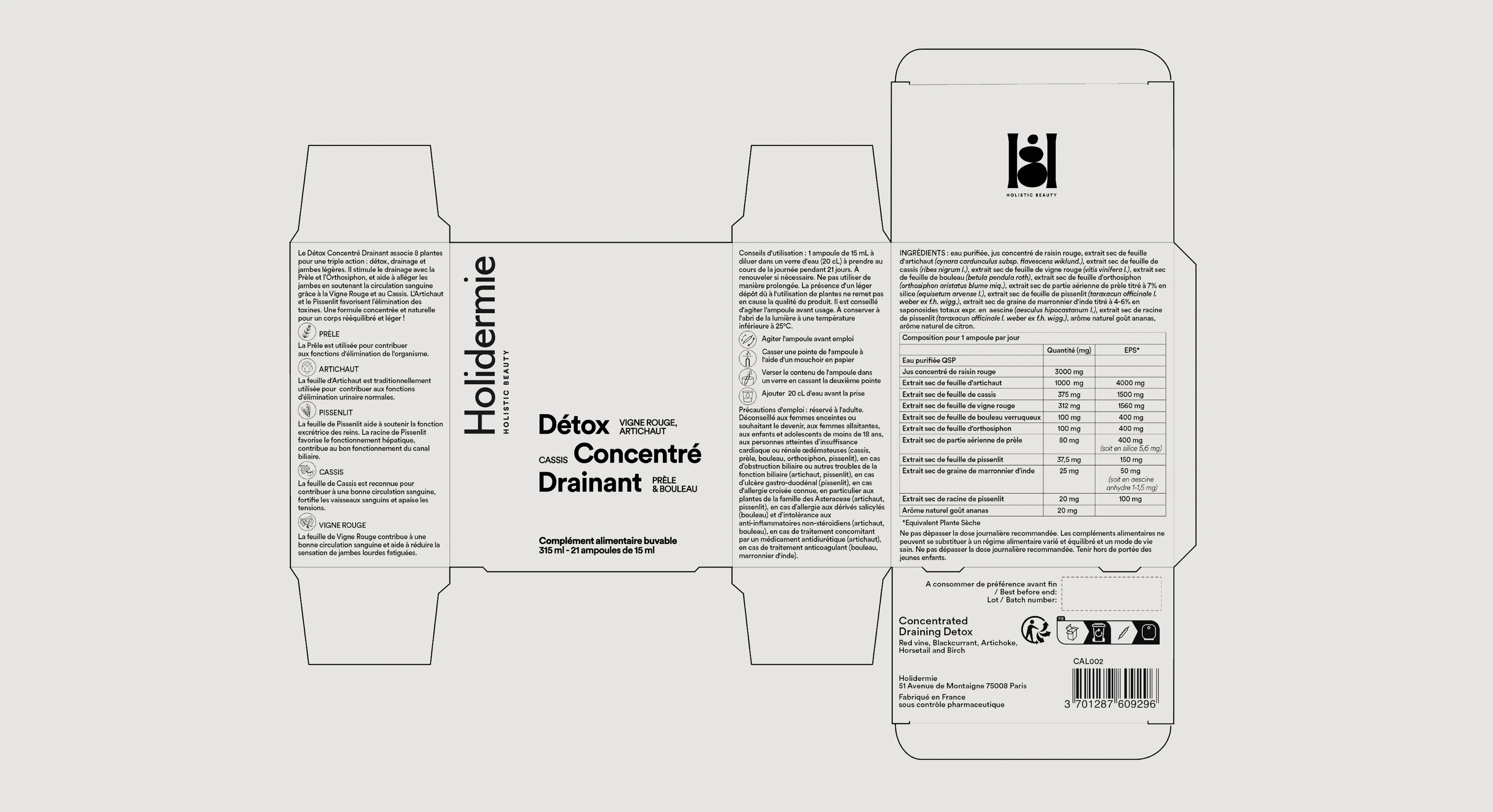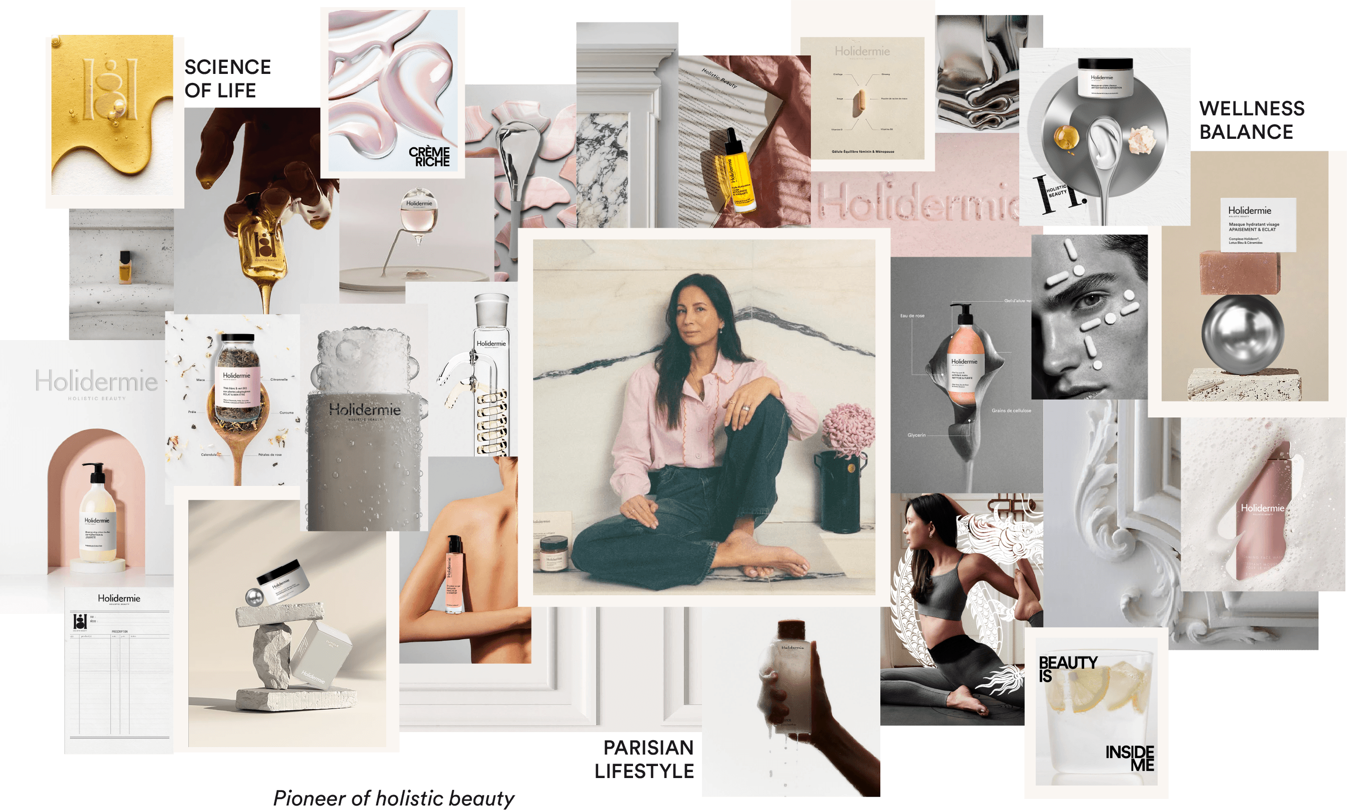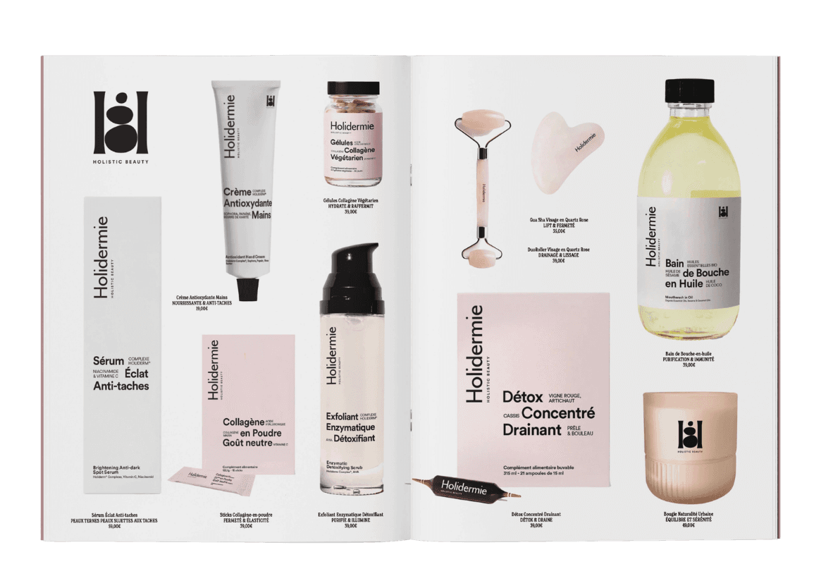 Le brief était clair : un monogramme, des packagings plus structurés, une esthétique sensorielle. L’objectif ? Révéler la singularité de Holidermie à travers une identité visuelle cohérente et durable. Le résultat : un monogramme, deux lignes pour le “H”, trois galets pour les trois piliers de la marque : soins, compléments, outils beauté. Une identité simple, mais signifiante. Ancrée, douce, équilibrée. Les packagings suivent le mouvement : nom sur trois lignes, typo bold, structure claire.